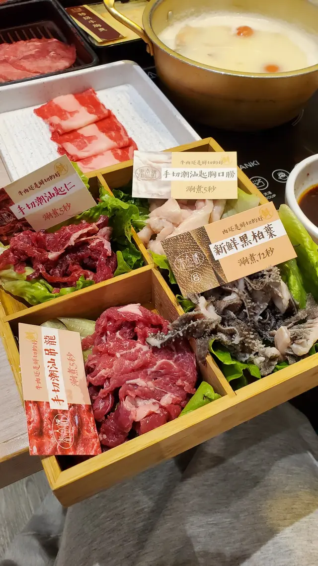 唔洗北上就可以食到潮汕牛肉!先來四格主打手切潮牛,包括肉質細嫩帶少量筋花的匙仁、肉味濃郁帶有適度咬口的吊龍、爽脆口感中透出豐盈油脂香的胸口撈,以上涮5秒即可食;至於新鮮黑柏葉就要涮12秒,爽彈度十足。