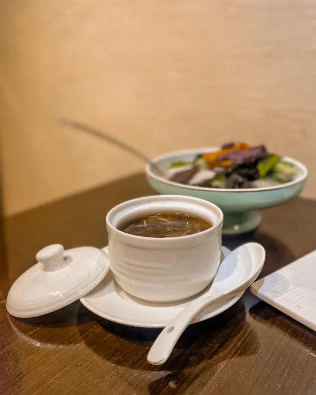 素翅配上數鮑魚、海參和木耳絲等配料,爽口好吃。湯羹還澆上麻油,非常惹味。