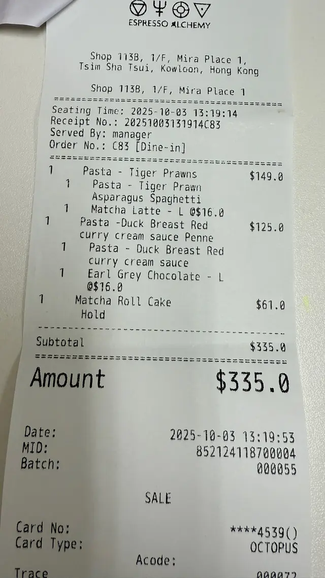 濃香不膩!新出的紅咖哩鴨胸忌廉長通粉好食🍝🍵 喂食寶寶等級42025-10-1162 瀏覽 關注 最近同朋友喺 Espresso Alchemy美麗華食lunch,真心想推介。先嚟香煎虎蝦配蘆筍辣蕃茄汁意粉:虎蝦煎到香口,配上清爽蘆筍,同帶辣勁嘅蕃茄汁,酸香開胃,意粉掛汁到位🍝🦐。同埋試試新菜式—紅咖哩鴨胸肉忌廉長通粉,紅咖哩與忌廉互相融合,鴨胸香氣滿載,長通粉口感彈牙,濃郁之餘不覺膩🍛🦆。飲品方面,Uji Ceremonial Matcha Latte 味道順滑,茶韻清晰🍵;Earl Grey Chocolate 帶伯爵茶香與可可醇厚交織🍫。最後以生酮宇治抹茶忌廉卷作結,抹茶芳香、忌廉輕盈,滿足感剛剛好🍰。整體表現相當討好,鍾意意粉同抹茶嘅朋友值得一試✨以上食評乃用戶個人意見 , 並不代表OpenRice之觀點。讚好分享濃香不膩!新出的紅咖哩鴨胸忌廉長通粉好食🍝🍵 Espresso Alchemy (美麗華廣場1期) https://s.openrice.com/QrbT0qC5U00檢舉 張貼 評分5味道5環境5服務5衛生5抵食用餐途徑堂食