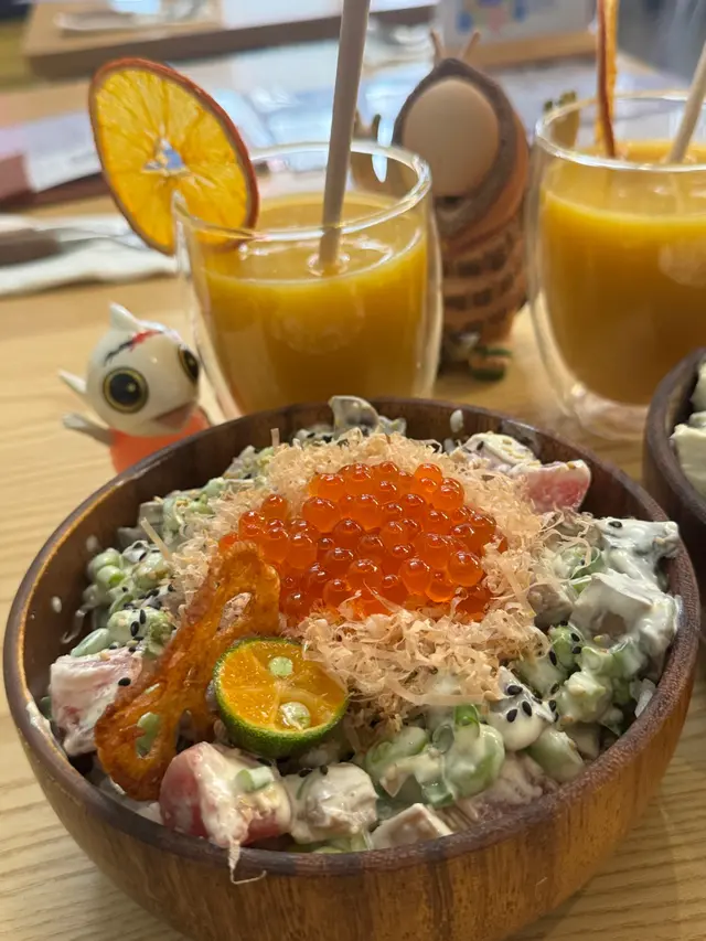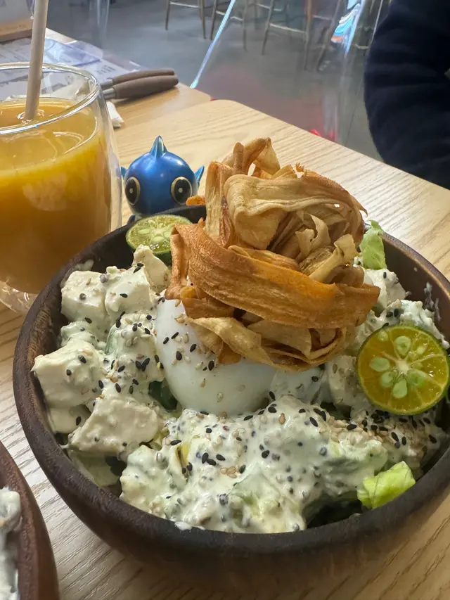 慢煮雞胸、牛油果、炸牛蒡、溫泉蛋、藜麥等配料 呢個基底就轉作沙律 雞胸唔會煮到好嚡 加上青檸汁提鮮 呢碗有滿滿的蛋白質😊健身人士非常啱食