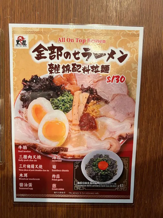 一見到個menu就覺得呢個好吸引🥰 因為呢一個有齊晒唔同嘅配料 包括有炆得好腍嘅牛筋 入口即溶嘅三層肉叉燒 肉質厚實嘅豬肩叉燒 同埋拉麵配料 木耳 醬油蛋 海苔 筍 炸蒜 蔥等等🍜 拉麵嘅湯底係豬骨湯 非常濃郁 面底有得根據自己嘅喜好選擇軟硬程度 有齊咁多款配料真係好豐富