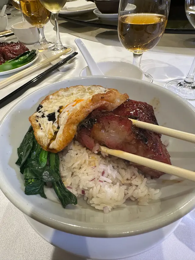 終於到咗主角「黯然銷魂飯」!十年賣咗超過兩萬碗,呢道菜水準依然好高。叉燒肥瘦均勻,一碗用哂一隻豬成條梅頭部位,邊位仲有少少炭火香。一隻完美嘅燶邊太陽蛋,戳穿蛋黃,包住粒粒分明嘅香米,再撈埋香港本地做嘅豉油,每一口都充滿幸福感,真係「銷魂」!