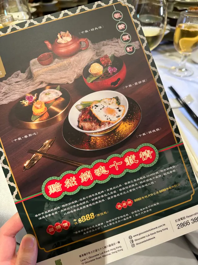 「黯然銷魂十載情」限定套餐,每位$388(兩位起),四道菜,仲免茶芥同小食(另加一服務費),即日起去到明年3月31號(2月10號至3月3號除外),想去嘅朋友記得提前訂位呀!酒店中菜廳嚟講性價比真係高。可以食到經典嘅黯然銷魂飯,仲有功夫湯同懷舊點心,無論心思同味道都高水準!