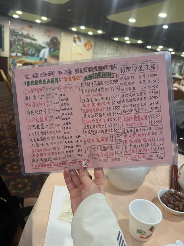 今晚同朋友喺灣仔做完嘢,想搵間坐得舒服又有鑊氣嘅中菜館,最後揀咗呢間老字號「盛記酒家」。一入去就感受到嗰種傳統酒家嘅氣氛,燈光光猛,侍應姐姐雖然忙但手腳好快,沖茶遞水都好俐落。坐低叫咗壺茗茶($15),香片夠滑唔會有澀味,暖暖胃先開始點菜。