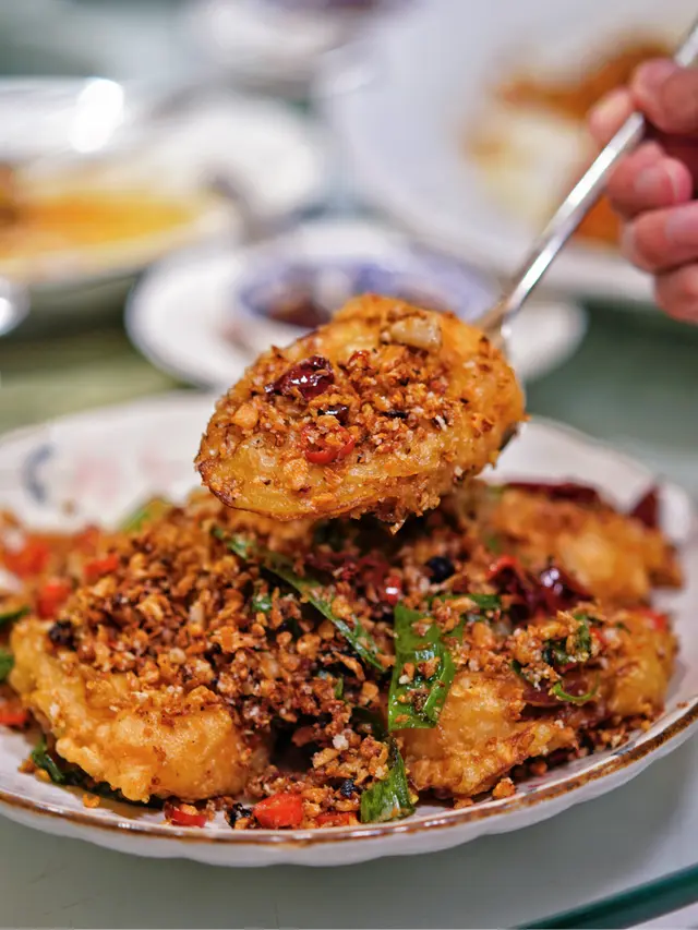 避風塘百花茄子 ($68): 呢個係一個驚喜!平平無奇嘅炸茄子,中間釀咗蝦膠再炸,外脆內軟。茄子本身吸油,但呢度處理得唔錯,唔會成口油。配埋少少避風塘蒜蓉,即刻昇華成一道惹味小食,性價比極高!