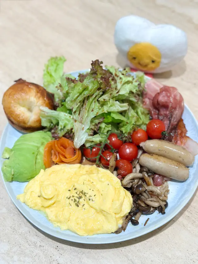 in:joi 經典早餐 : 經典之選全日早餐選用新紀元卵做炒蛋,搭配煙肉、牛油果、煙三文魚、本菇、車厘茄和新鮮沙律,再配上迷你酸種貝果,份量豐富