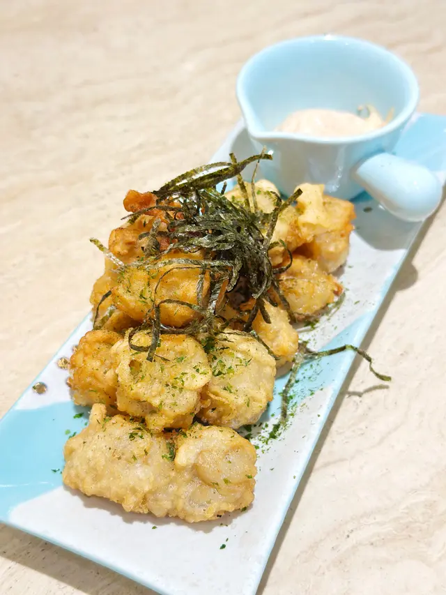 炸墨魚咀 : 墨魚咀蘸上粉漿油炸,外皮香脆,內裡口感爽脆,再蘸少少明太子醬就已經好惹味