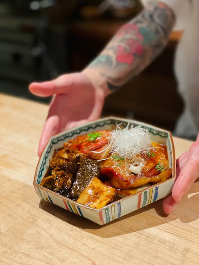 最後烹調時令綠皮茄子、野生舞茸、牛蒡絲