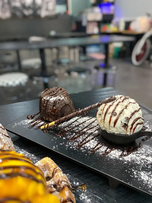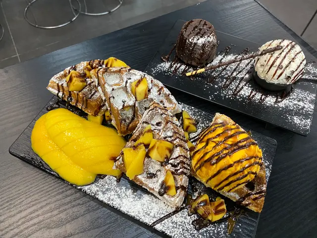 竟然有四塊熱辣辣嘅窩夫,仲有原隻芒果,同埋芒果雪糕、朱古力醬同埋糖霜,真係好足料!窩夫除咗芒果味之外仲有士多啤梨、鮮雜果、香蕉脆脆、抹茶同埋雪糕窩夫🧇