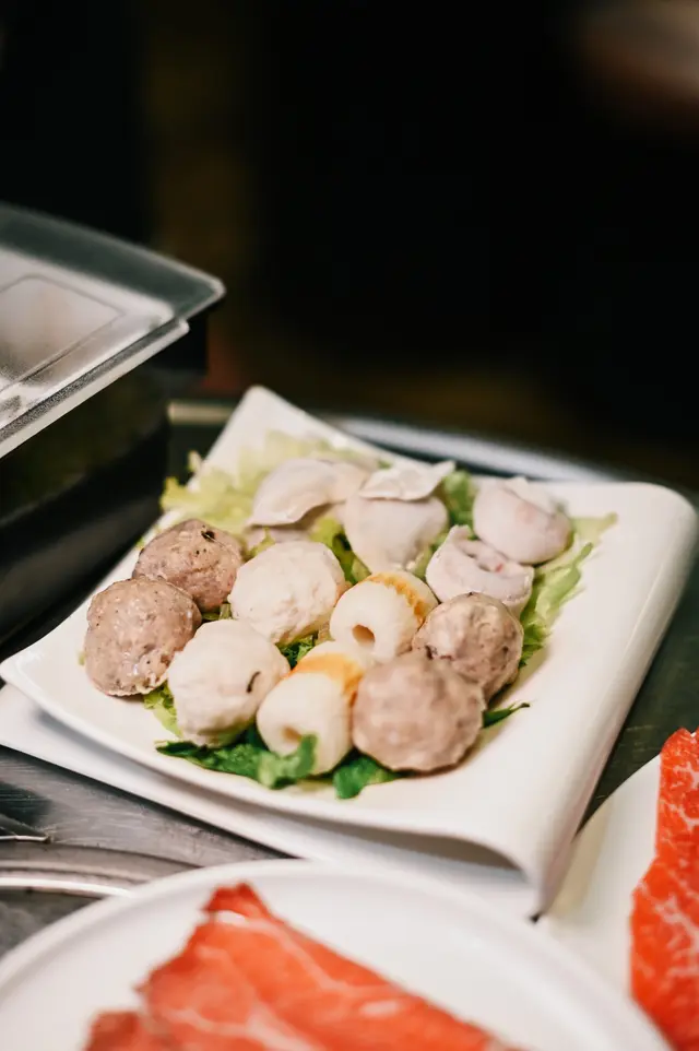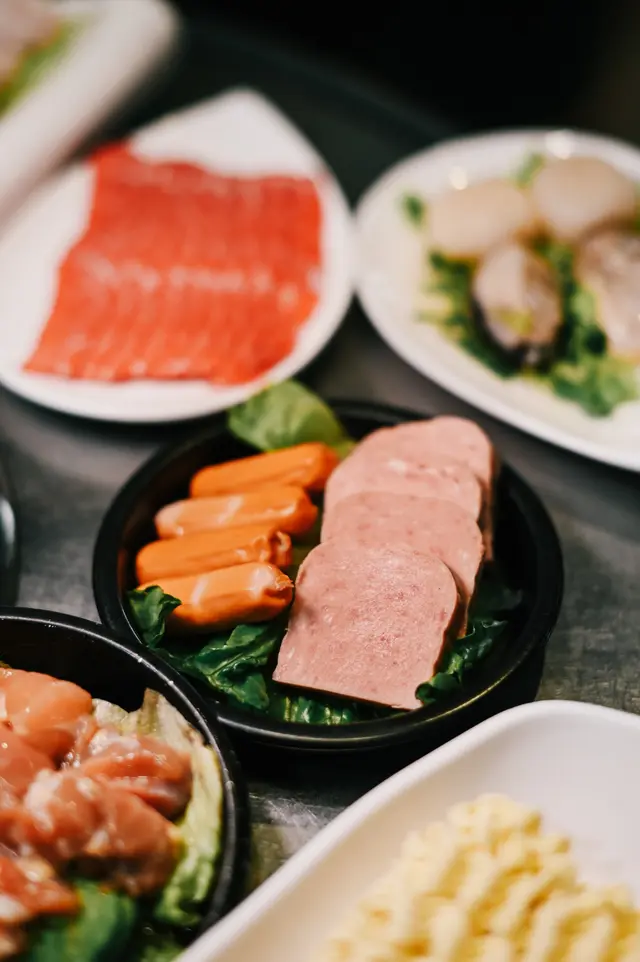 脆皮芝士腸 l 韓國午餐肉 l 芝士獅子狗卷 l 魚皮餃 l 香菇貢丸 l 爽口牛丸 l 彈牙墨魚丸 l 菜肉水餃 l 炸魚皮 l 什菌蔬菜拼盤