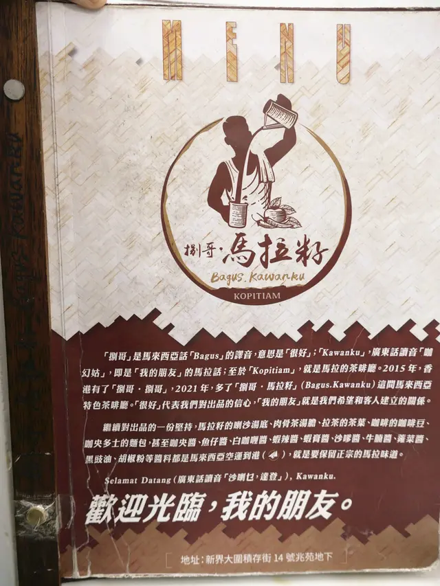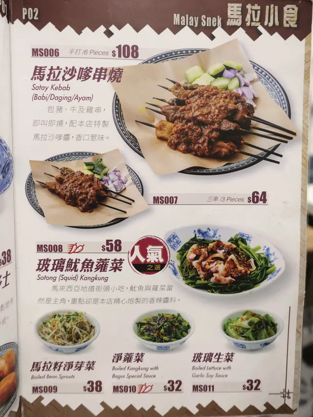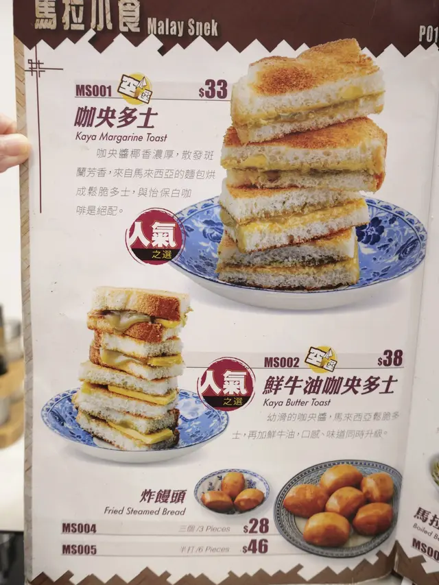 餐牌款式繁多,包括鮮牛油咖央多士、娘惹喇沙、肉骨茶、砂煲老鼠粉、檳城蝦麵等。