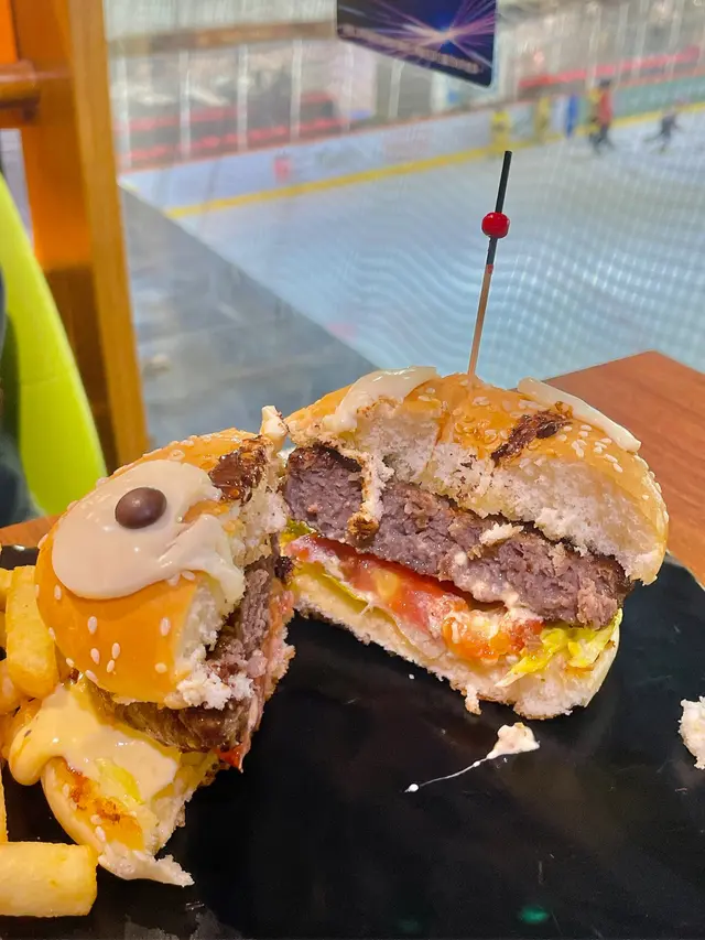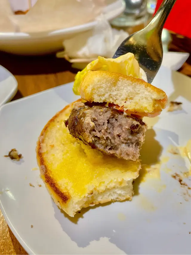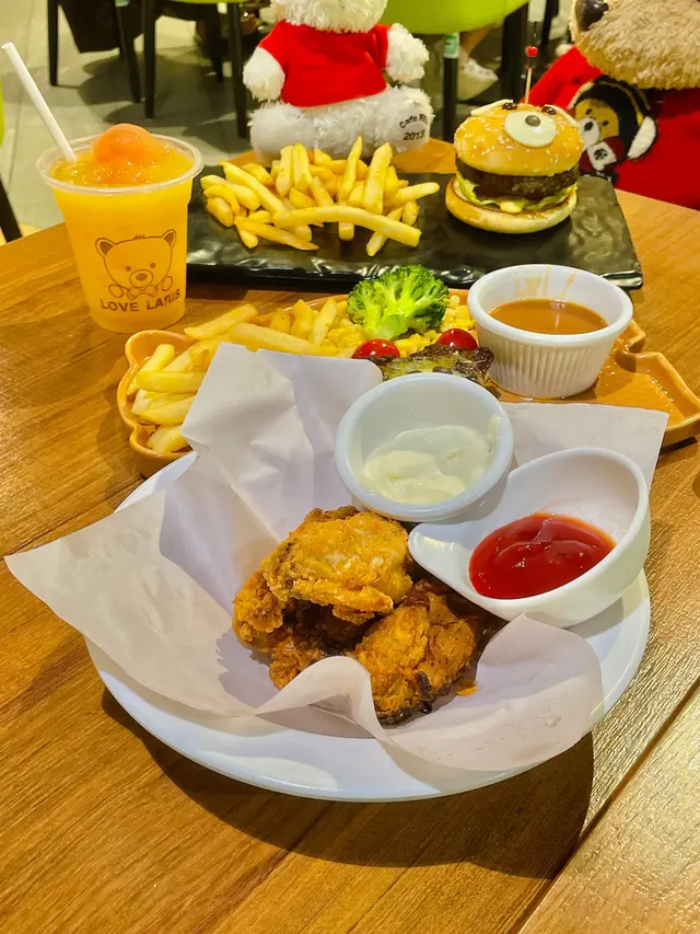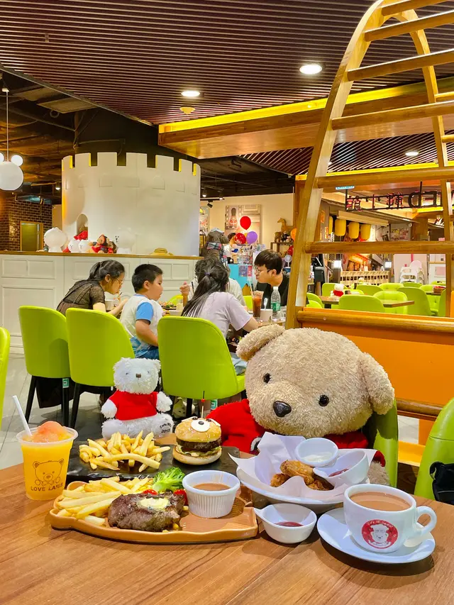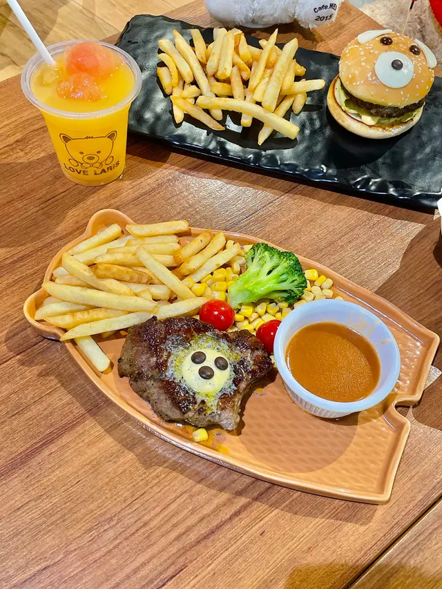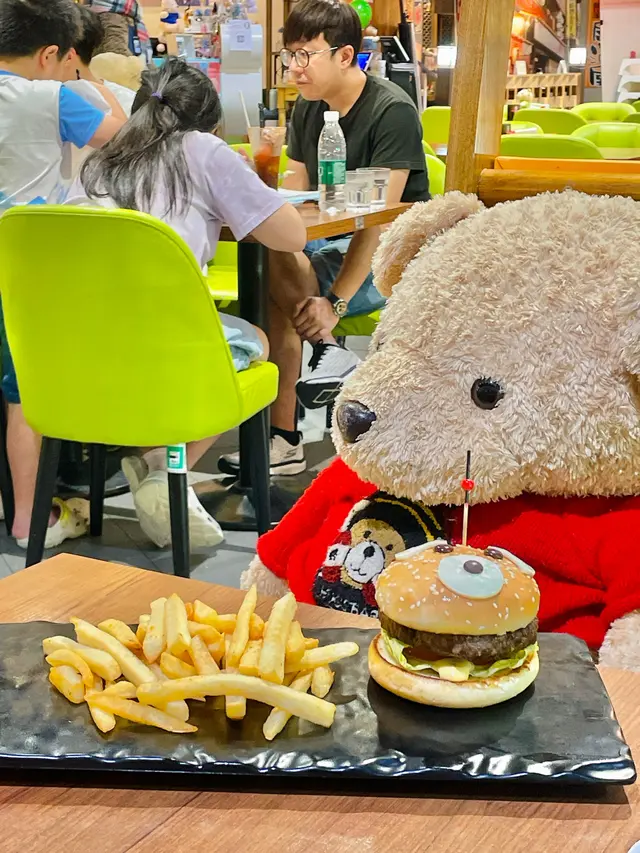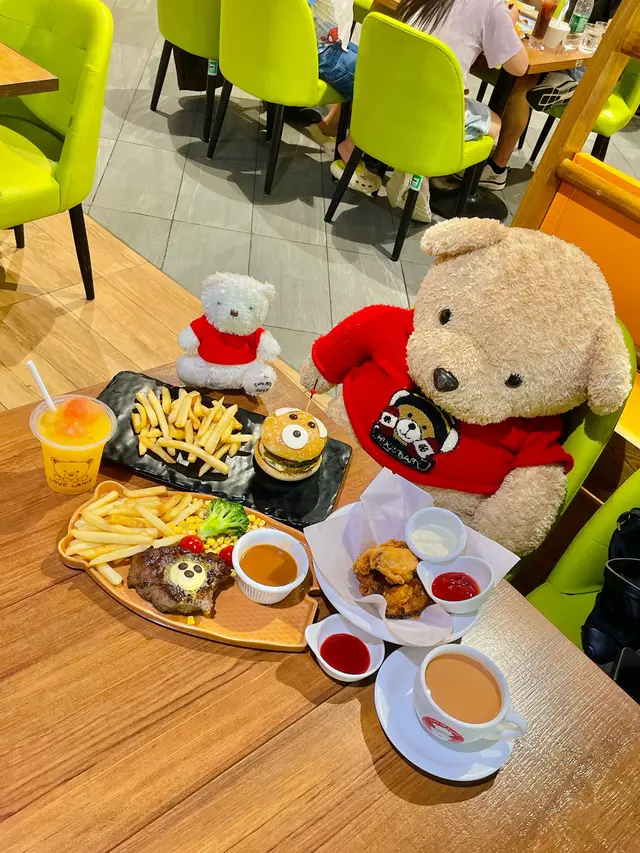 小熊堡套餐(單點$128),表面鋪有白芝士片、朱古力豆,白芝麻漢堡包底、面兩層內裏都搽滿牛油,食落非常香口,安格斯漢堡扒食落牛味濃厚,內有番茄、生菜、特製蛋黃醬,粗切薯條即叫即炸。