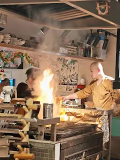我們坐在吧枱,面向喜之次爐端燒,清楚看見師傅純熟的技藝,他把整條喜之次屈曲穿在一枝竹竿上、離開炭火爐兩至三吋的距離,然後慢慢利用熱力烤脆。