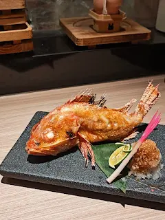 燒好喇!喜之次動態如仍在暢泳,魚身微曲、魚尾翹起,燒至金黃焦香。