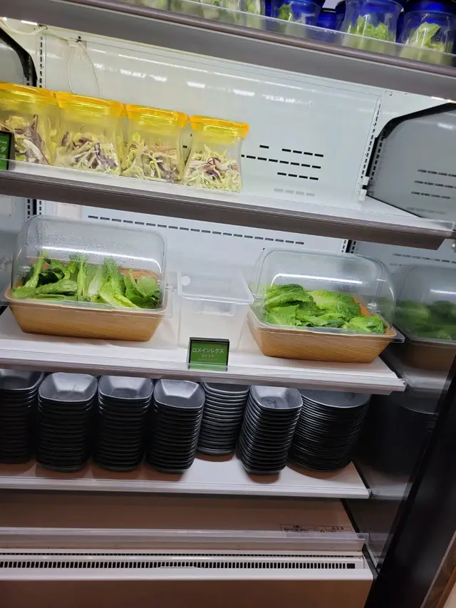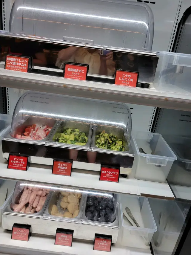 小人拿的前菜有凱撒沙律、咖哩牛肉、韓式泡菜、蒜味韮菜、蜆肉青瓜和京蔥絲。牛油果沙律或菜絲沙律罝於玻璃瓶內,隨意加凱撒沙律汁或日式胡麻汁,鮮爽開胃。其他當中蜆肉青瓜最為可口,調味恰好。