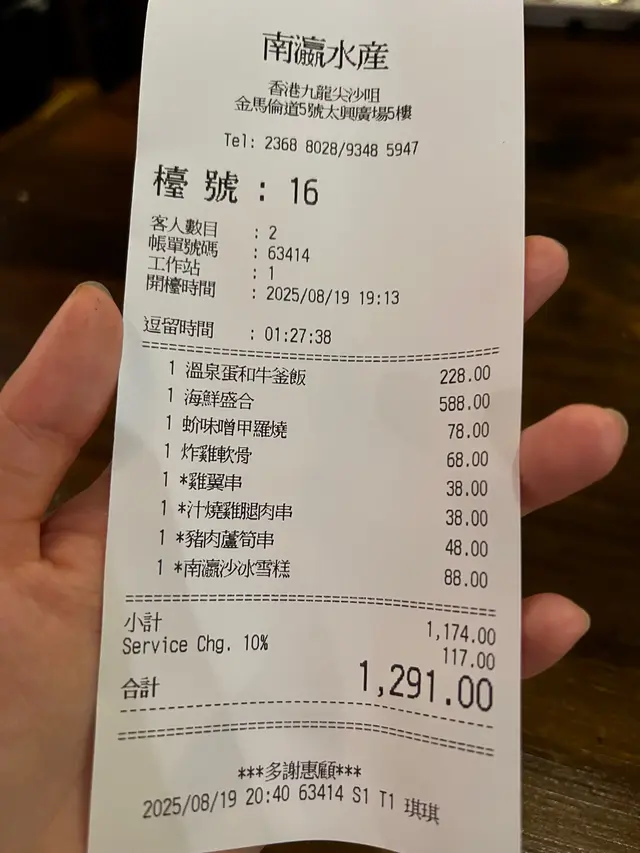 💰 總計: $1291, 2位用餐(已包含10%服務費)
