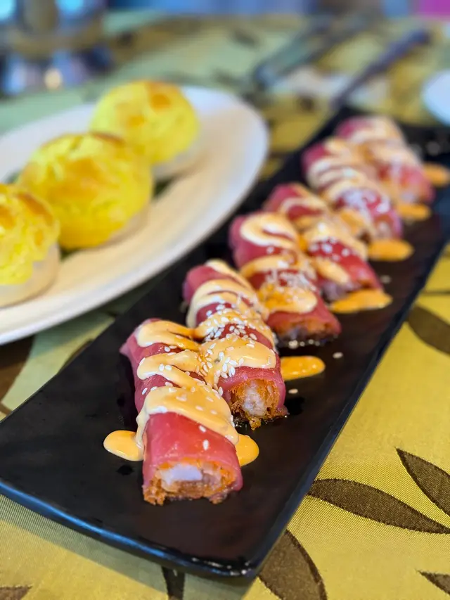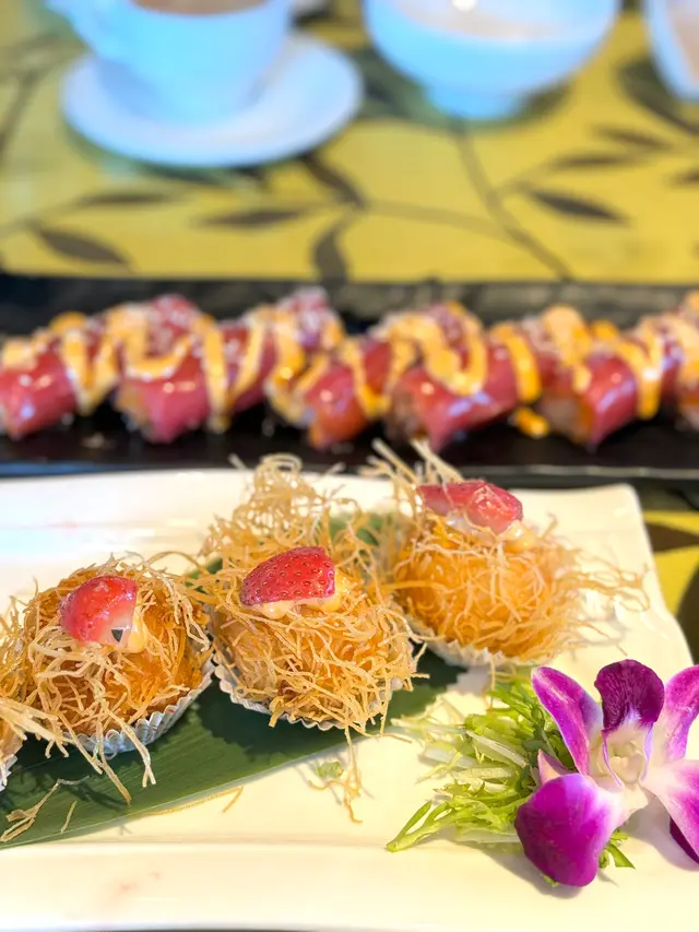 牛仔骨牛味香濃,黑椒同蜜餞平衡做得唔錯;棉花雞嘅魚肚好爽滑,配上健康嘅鮮淮山口感更加豐富;菠蘿黑毛豬叉燒餐包誠意推薦,菠蘿皮做得酥脆,黑毛豬口感特別爽嫩,加上甜甜地嘅醬汁堅正;紅米脆皮鮮蝦腸,每件做得精緻,口感脆卜卜,加上千島醬以及芝麻又更香口;百花球做得巧妙,特別係外層嘅千絲,裏面包裹住炸蝦球,沾上酸酸甜甜嘅醬汁以及士多啤梨果肉,確實幾好食~