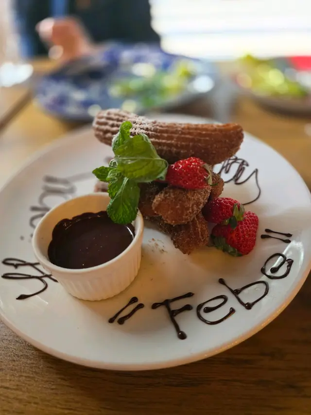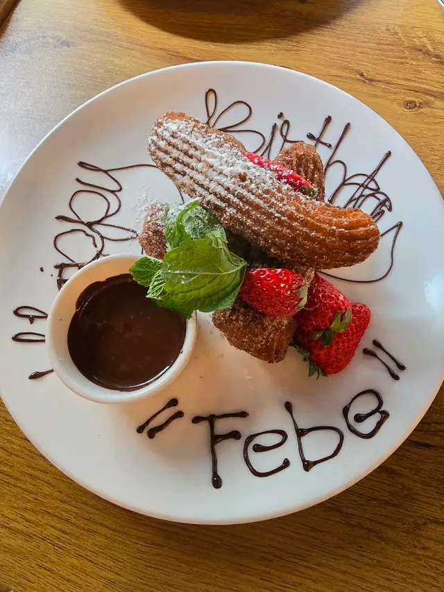 熱辣辣嘅油條,炸得香香的,沾滿肉桂粉嘅 Churros 一件一件層層疊,又以 🍓 點綴,但稍為偏甜,所以唔使點咁多朱古力醬🫕。另外要讚一下店員,用盡成隻碟嘅空間寫上 Happy Birthday 🎶 整個擺盤又真係幾靚喎 🤎壽星女表示好開心 🥰
