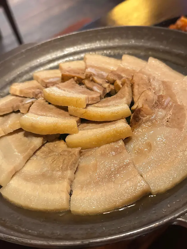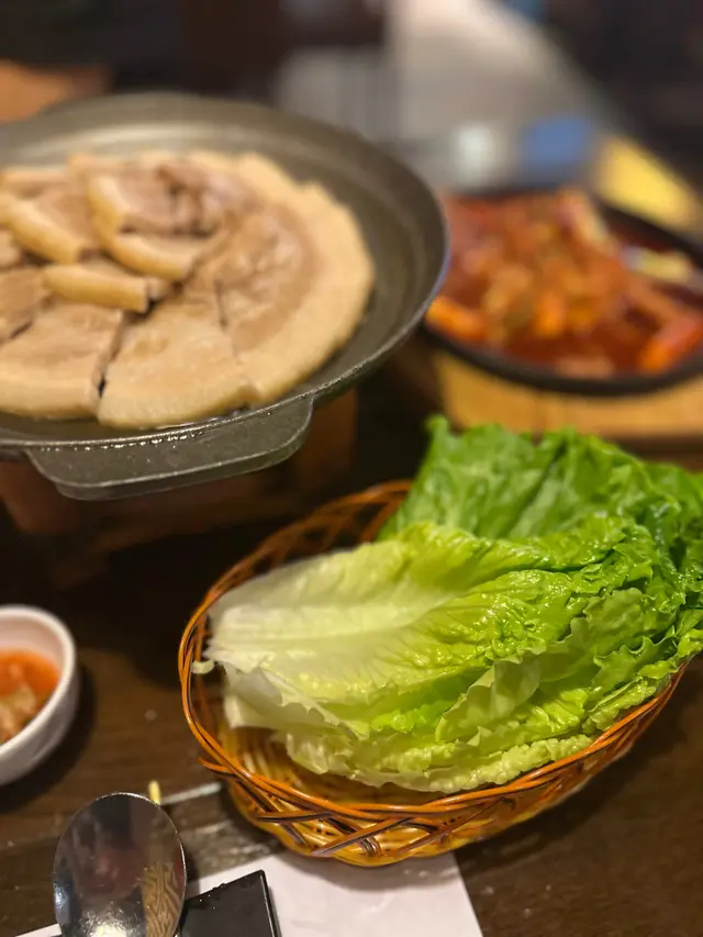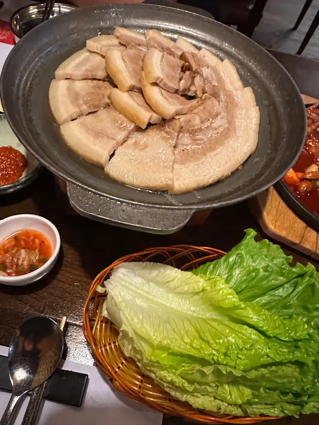 生菜包裹的滿足感十足!熱騰騰的鑄鐵鍋上桌,蒸煮過的豬肉片肥瘦適中,搭配清甜的洋蔥與韭菜,蘸上特製韓式醬汁,再用新鮮生菜包裹蒜片一同入口——肉香、蔬菜爽脆與醬汁濃郁層層交疊!