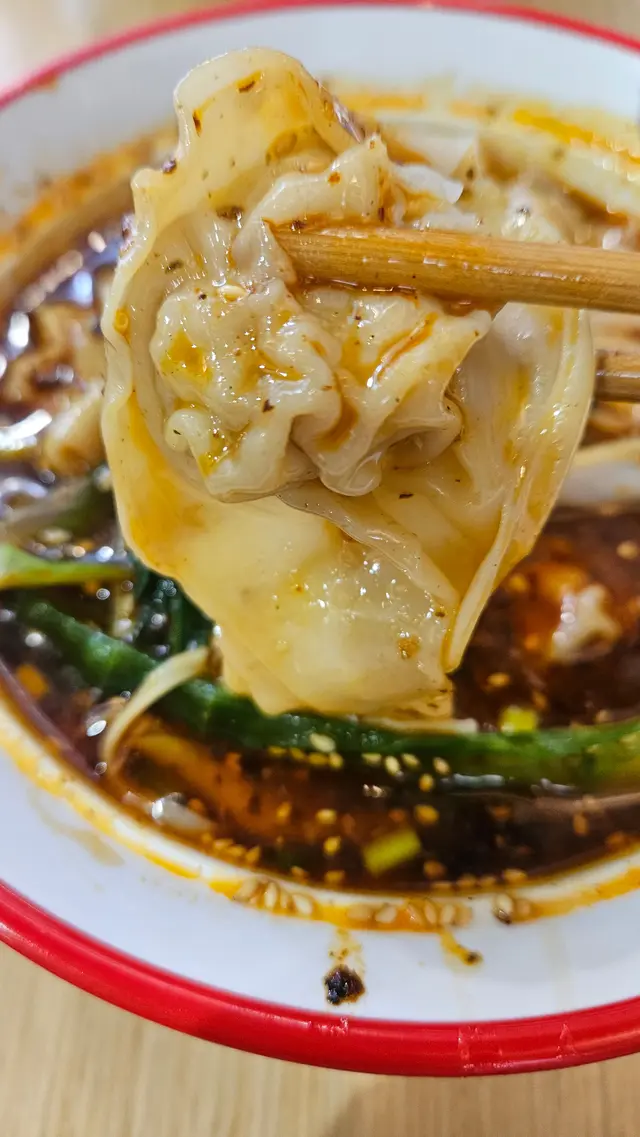 抄手皮薄餡足,浸在香而不燥的紅油裡,鹹香麻辣,非常過癮!