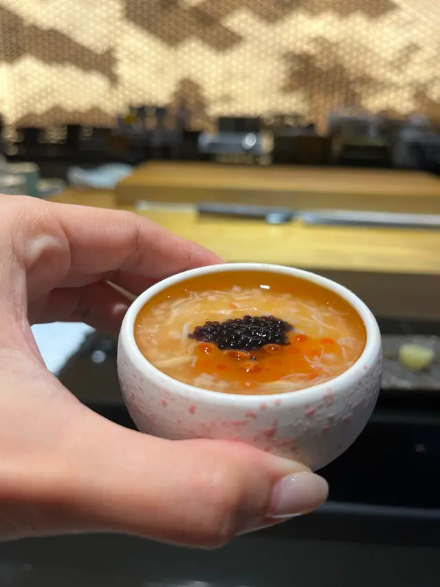 【Steamed Egg - 7/10】 Silky smooth steamed egg that requires no chewing, topped with crab meat and caviar for an explosion of umami! 🦀 The caviar’s saltiness blends perfectly with the egg’s softness.