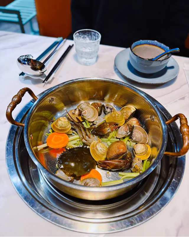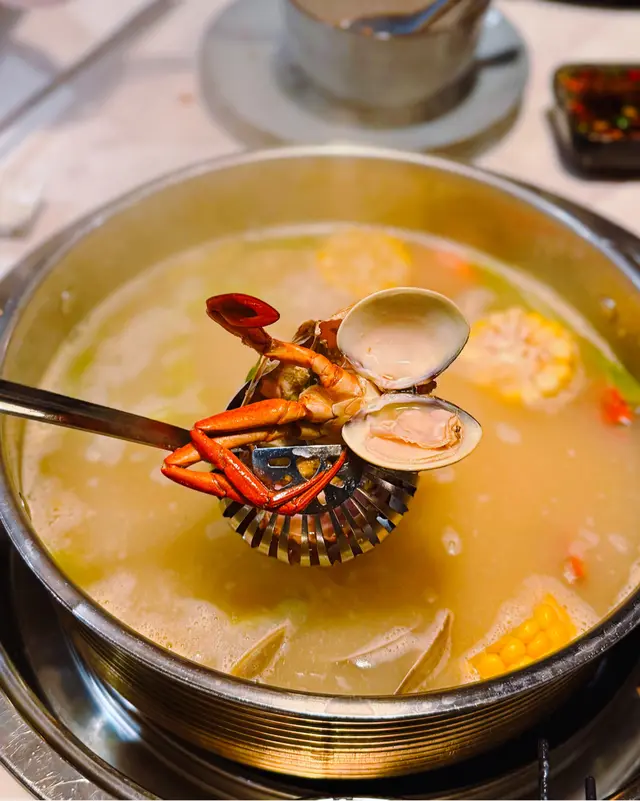 這次點了招牌的火焰沙白蟹鍋,蟹鍋上桌時,店員會點燃火焰,帶來視覺效享受;湯底以海鮮熬製,用料豐富,味道清甜濃郁