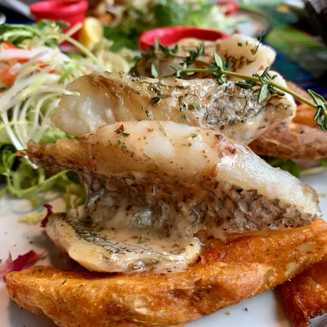 我和朋友都點了鱸魚,鱸魚皮脆肉厚,已切件方便食用,鱸魚下方的薯角不但炸得酥脆而且份量十足,伴碟的沙律菜還有蟹柳絲,配芝麻醬得很清新。