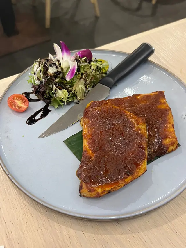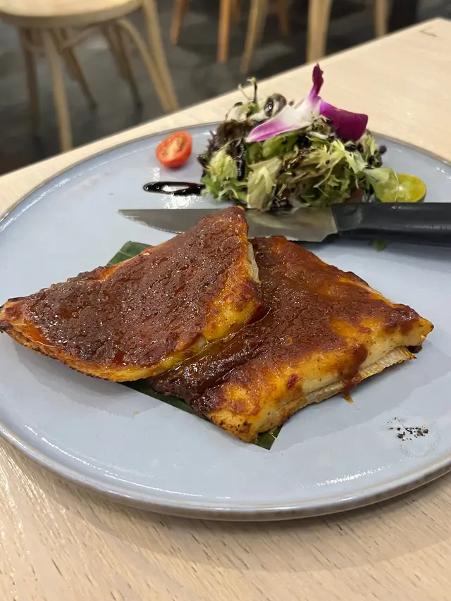 馬來參巴烤魔鬼魚$128,參巴醬是星加坡特色,味道濃郁帶點辣味,將魔鬼魚的味道層次提升。魔鬼魚的魚肉質地有點像魚翅,是一疏疏的軟骨和魚肉交替着。