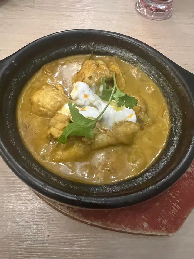 牛油蒜蓉油酥餅配咖喱雞腿$98,牛油蒜蓉油酥餅,鬆化帶着濃烈的牛油味道,效果有點像印度的油酥餅。咖喱的味道不算太濃烈,有點像馬來西亞咖喱,有豐富的椰漿味。雞腿採用了雞翼旁邊的雞腿,尺寸雖小,肉質比較有咬口。