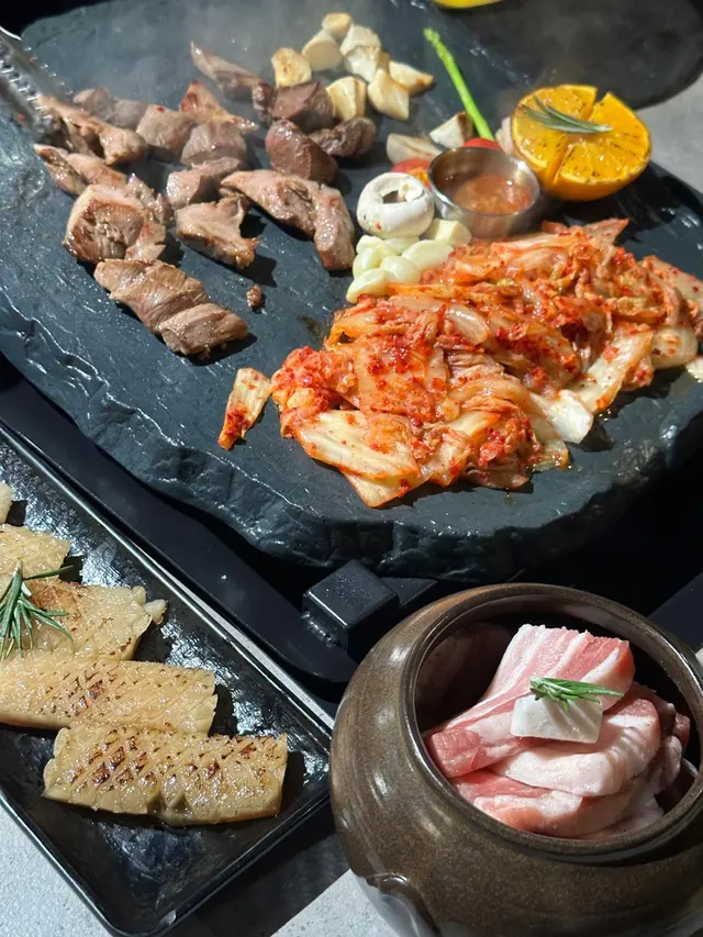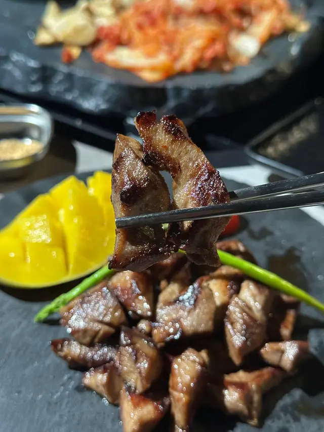 濟州直送低溫屬性黑毛豬,用韓國訂製火山石烤盤烤到外皮焦香,內裡油脂豐富卻肥而不膩,剪成細塊包埋生菜,蘸埋韓式醬汁食超正!😋
