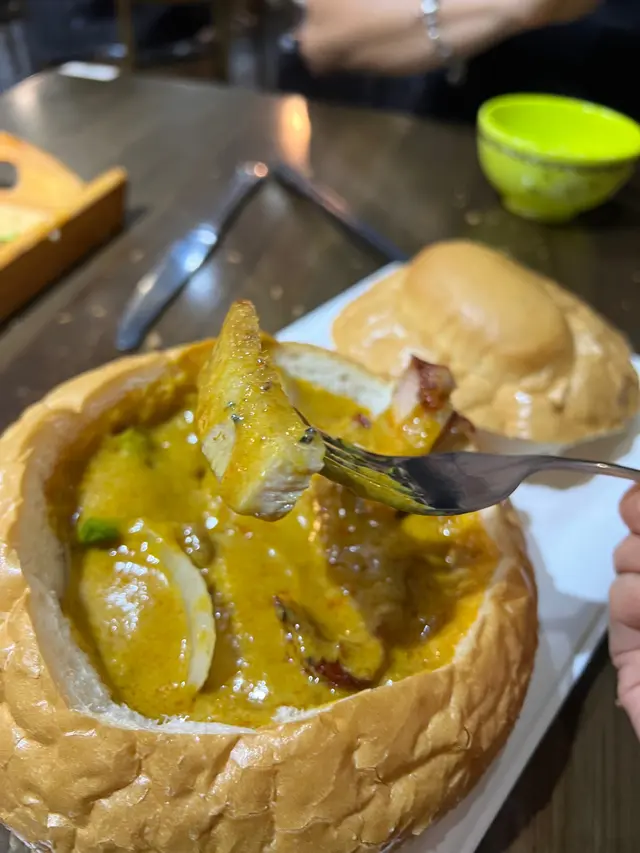 內裡塞滿醬汁和香煎豬頸肉,肉質嫩滑多汁,帶點炭燒香氣,麵包沾上醬汁,一啖一啖停唔到口