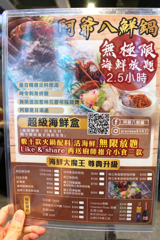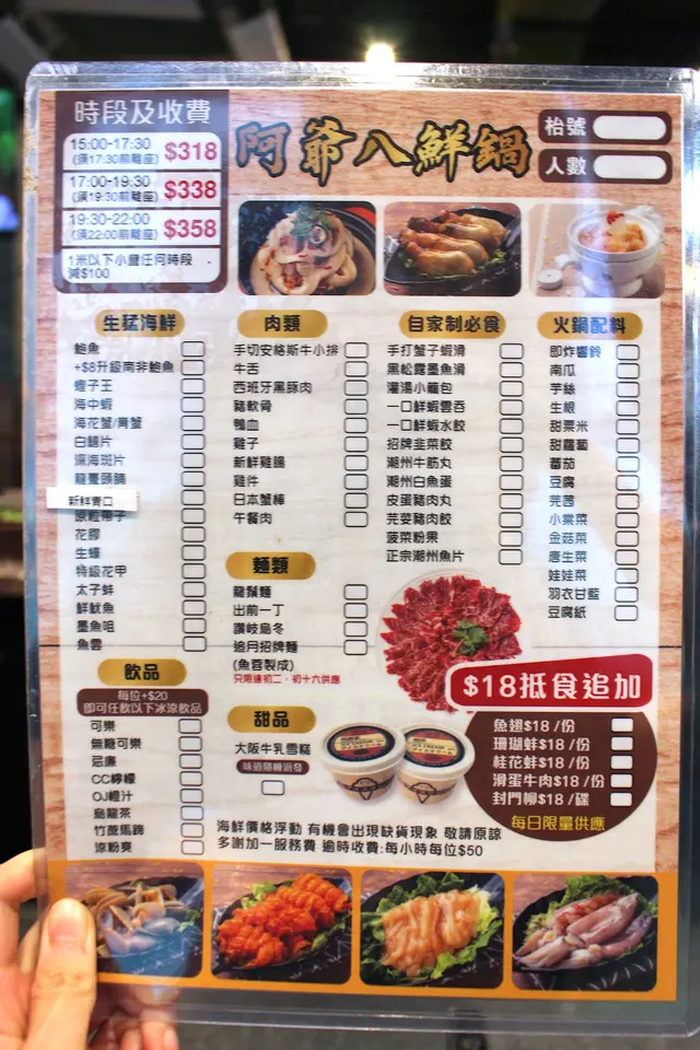 無極限海鮮放題分為15:00-17:30、17:00-19:30及19:30-22:00三個時段,每位由$318至$358不等,價錢雖然相比坊間一般任食火鍋略高,但單論任食海鮮款式都已經無可比擬。