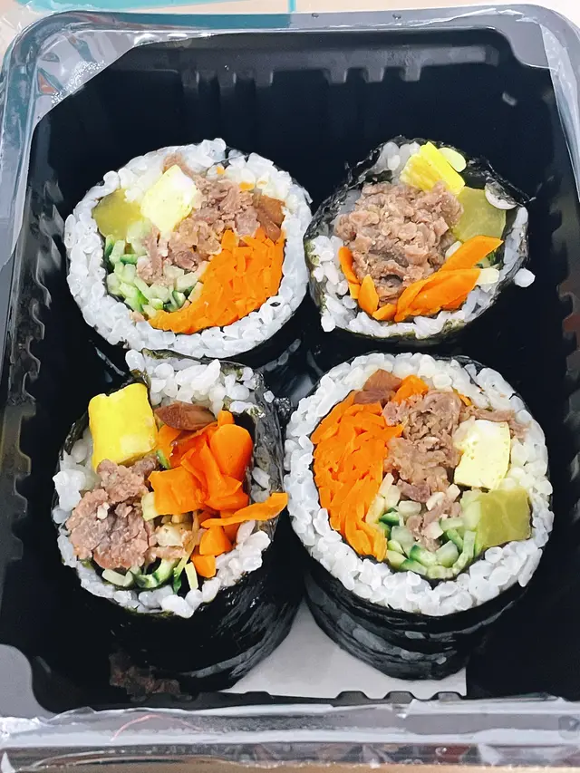 飯卷中間配料豐富,有紅蘿蔔絲,青瓜絲,雞蛋,烤牛肉,醃蘿蔔。一口咬下去,口感豐富,而且紫菜好有麻油香味。