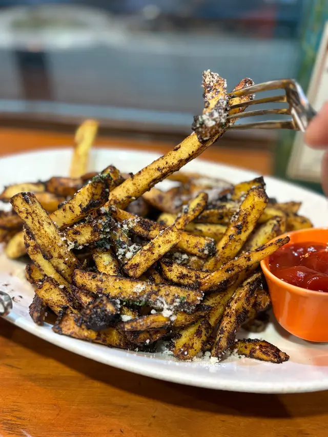 🍟 每條薯條都又粗又長超大份,用黑蒜醬炒勻鹹甜,香脆得來冇一般薯條咁油膩