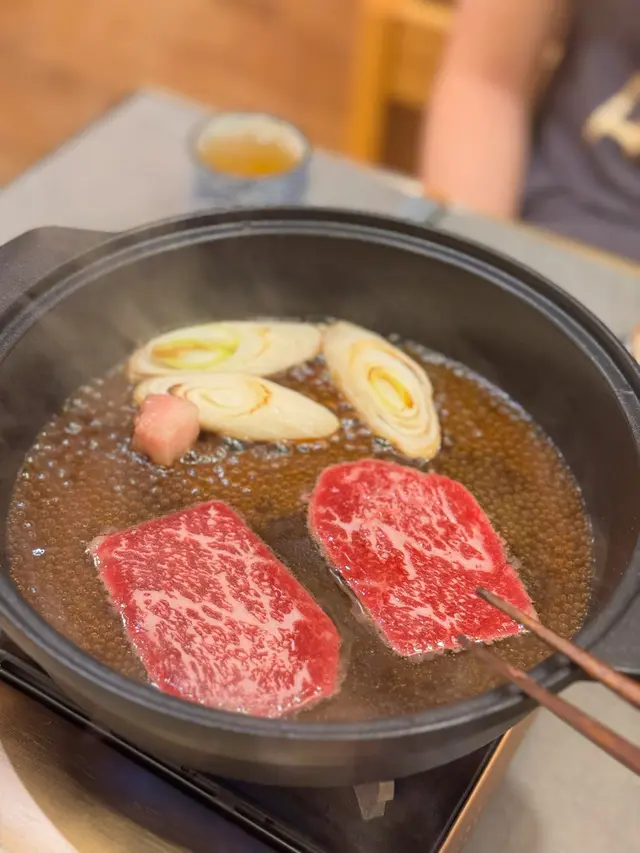 店員一開始會幫手開爐,先用牛脂開鍋,爆香大蔥和洋蔥🧅輕輕烚熟,入口然後加入秘製的壽喜燒汁,燒熱後就可以放肉落去🤤