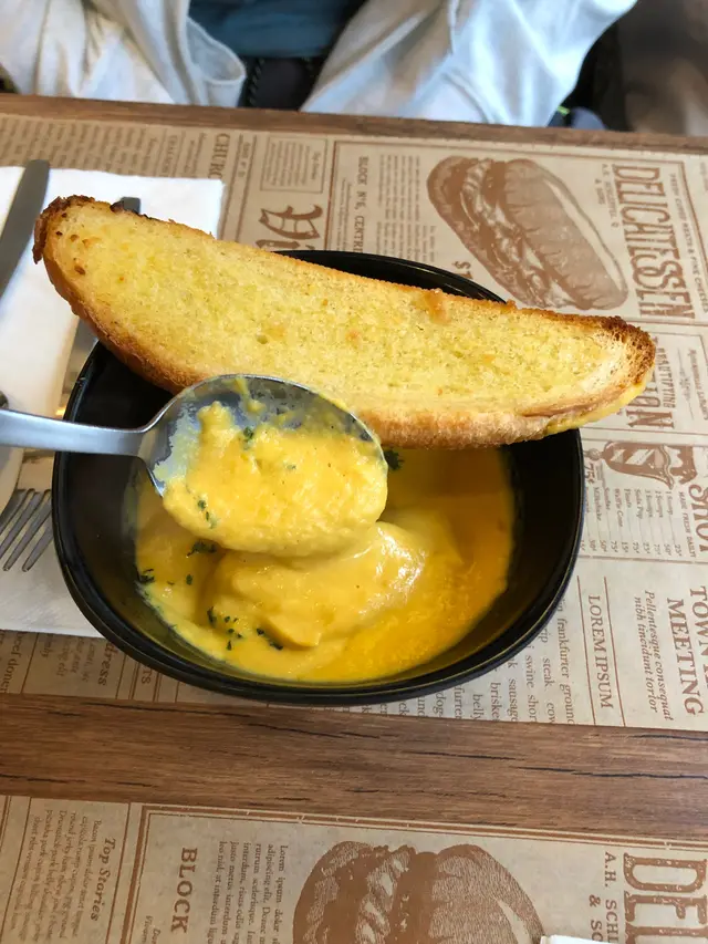 首先上桌的是午市套餐的餐湯-雜菜南瓜湯配蒜蓉多士