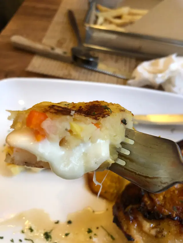 雜菜有紅蘿蔔粒及粟米粒,中間薯餅蓉口感綿滑,也是很有薯味