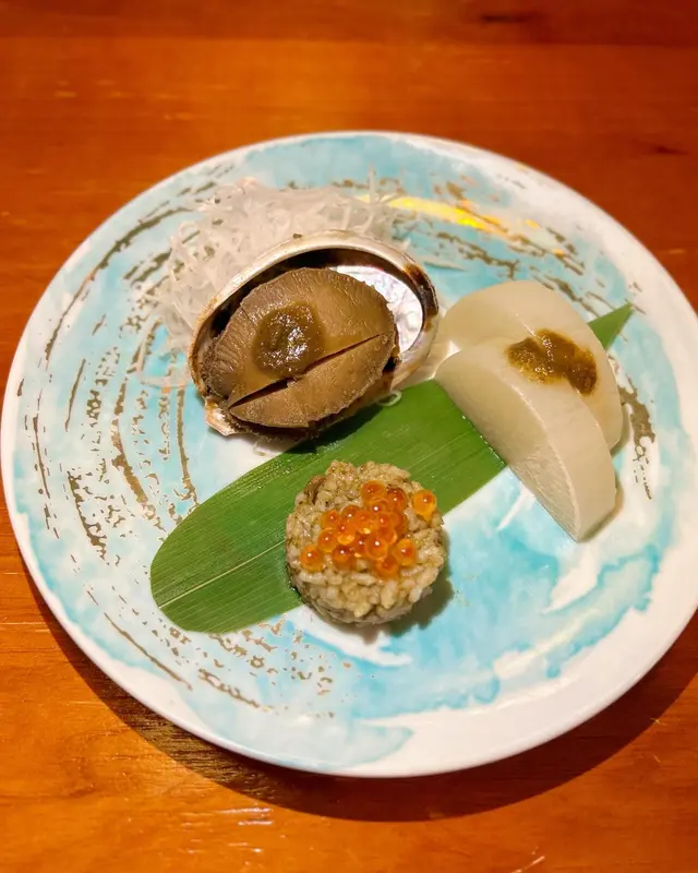 蒸過嘅鮑魚好彈牙,有溏心口感,將鮑魚裙邊、肝、三文魚籽撈飯食,鮮味濃郁,伴碟有慢煮蘿蔔,清甜。