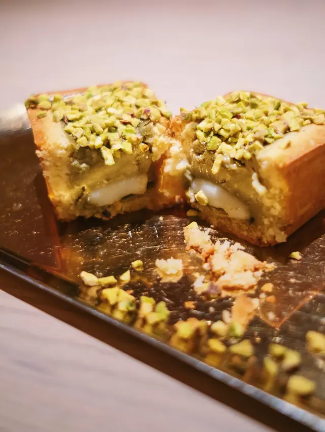 撻皮焗熱後香脆而鬆化,不算很重牛油香很heavy的那種;面層有大量開心果碎和稠滑的開心果醬、中層是順滑的開心果X蛋吉士餡、底層是軟糯的麻糬,整體也不錯👌🏻不過冇想像中咁濃開心果味,也不會很甜,吃完也不怕太膩(˶ᴗˬᴗ˶)