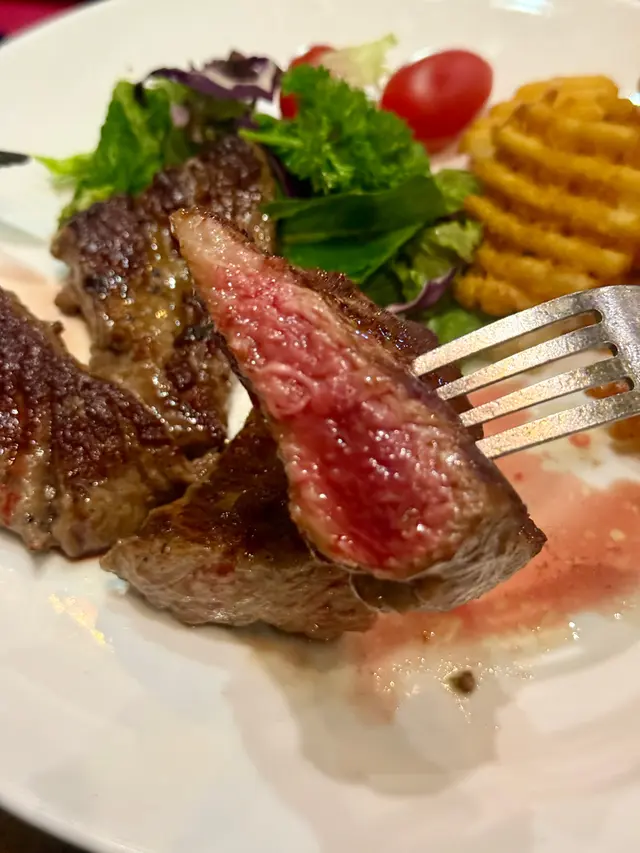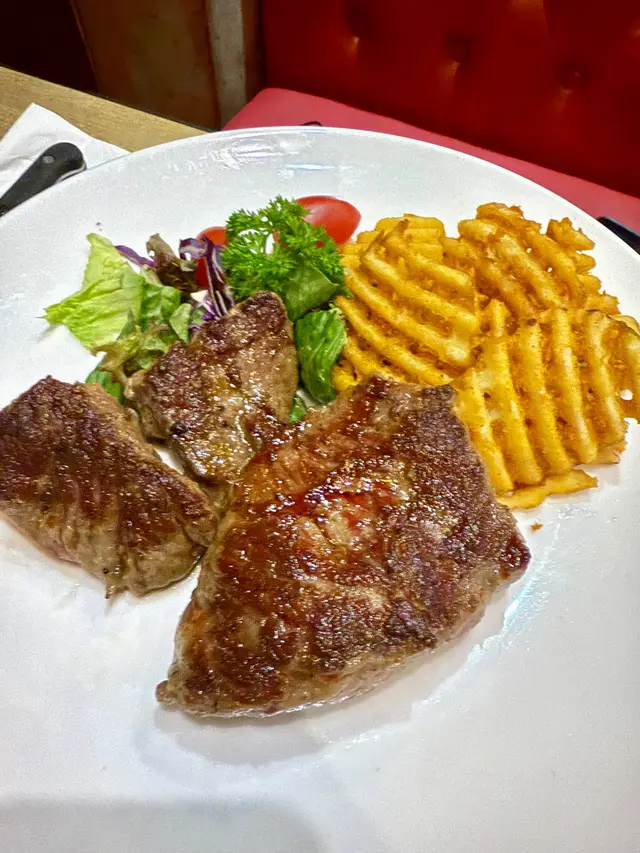 每款扒餐都有薯條同蔬菜,加埋黑椒汁,好滋味