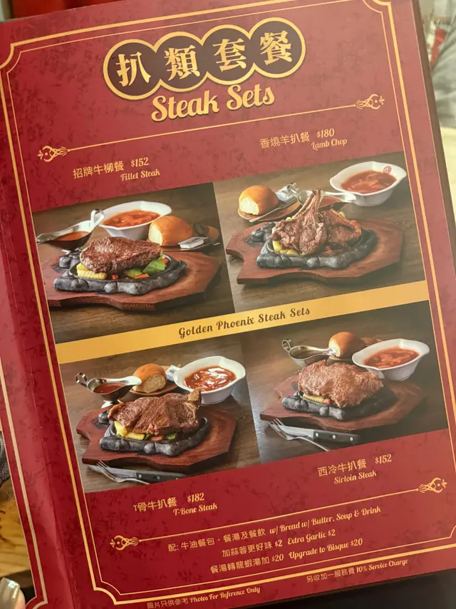 各式各樣嘅扒都有,好多選擇,套餐包括牛油餐包、餐湯、餐飲等