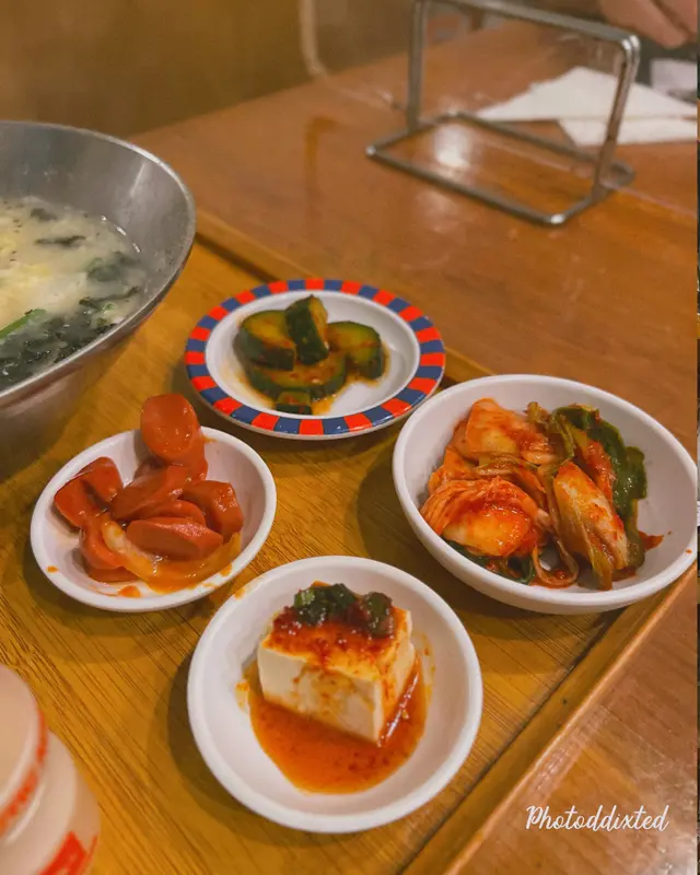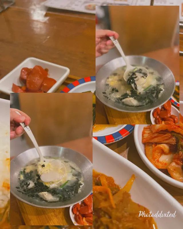 🤔佢每個set都會跟4碟小前菜 有豆腐、泡菜、醃青瓜🥒同醃香腸 仲有細細枝益力多 用木盤上菜 平平哋都有儀式感 睇見都開心啲