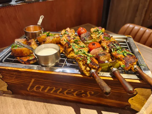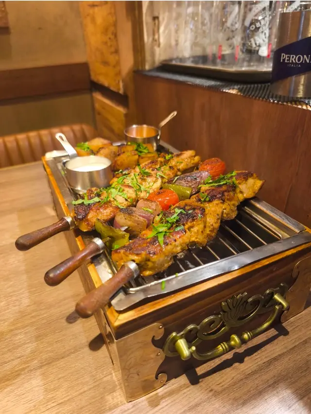 🍢主菜叫咗「烤雞串」(Chicken shish Tawook),用個好靚嘅木盒碳爐上菜,熱辣辣,幾有心思。雞肉烤得幾嫩,唔會太乾,碳烤香味幾突出,仲有薯仔同醬汁配搭。