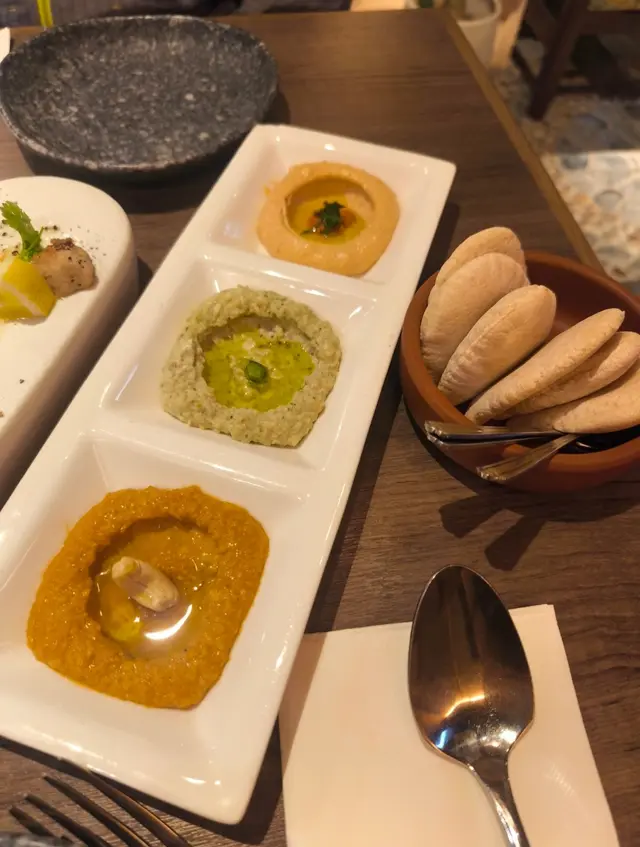 🥣頭盤試咗「Spicy Trio」,係三款唔同口味嘅豆蓉醬,配彼得包一齊食。醬料味道幾濃郁,但唔會太重味,反而幾開胃……但估唔到都幾飽肚😝😅。