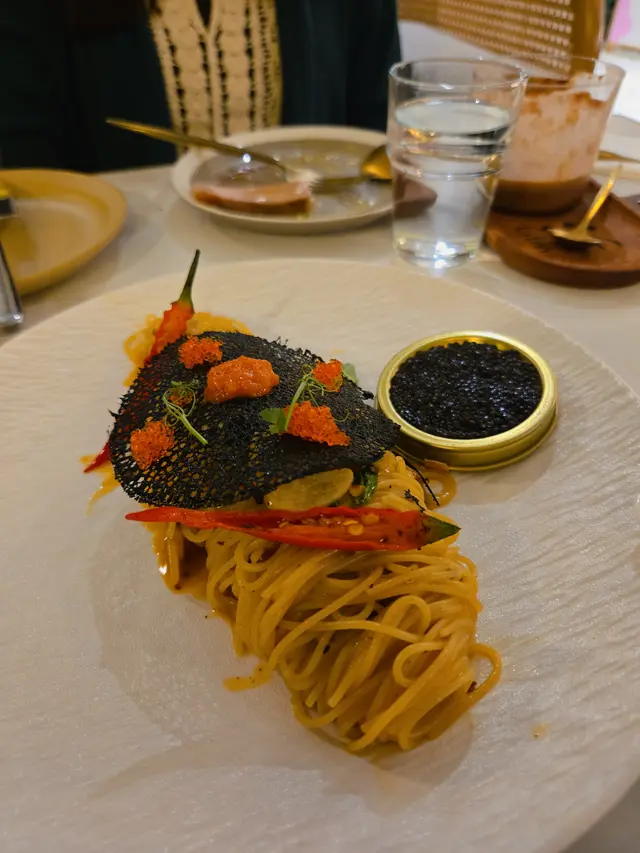 亮點在於侍應推來餐車,在客人面前,開了整罐西伯利亞魚子醬。天使麵(Angel Hair)極細,易斷易糊,這裡卻乾身分明。魚子醬的油脂甘香與鹹鮮,與明太子和飛魚籽的鹹脆口感交織,層次極為豐富。