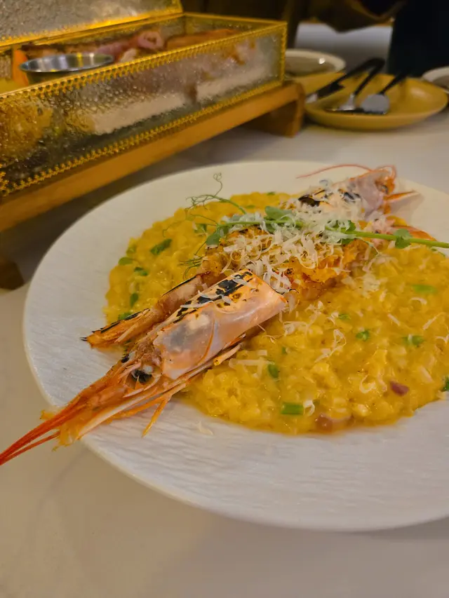 大閘蟹膏意大利飯配刺身紅蝦,羊奶芝士