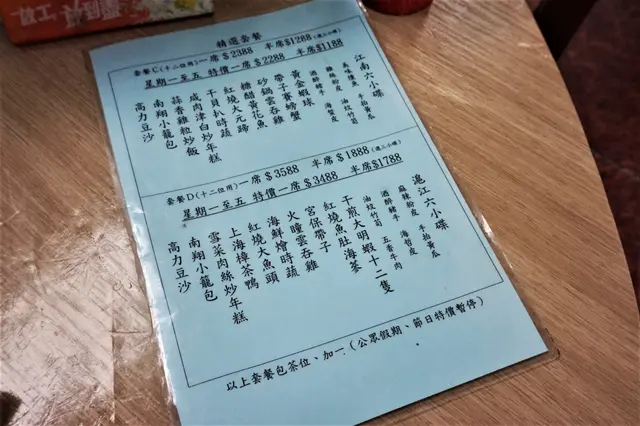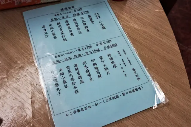 另外,仲有啲套餐餐牌,分4人、10人、12人,屬全包宴,已包茗茶及加一,店主亦強力「推介」,不過,個人覺得好似唔太抵,都喺散叫就算。