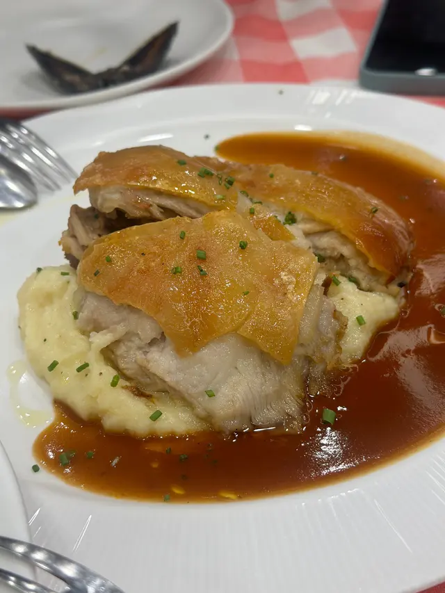 乳豬皮烤得香脆金黃,肉質鬆化多汁。油香與酸椰菜的清爽酸度形成完美對比,薯蓉質地柔滑、奶香濃郁,整體層次豐富。
