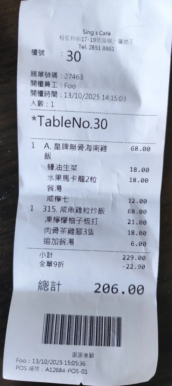這頓豐盛的午餐合共229元, 餐廳因為新店開業,全單九折,只需206元,真是物超所值!每道菜都讓我們感受到美食的魅力,期待下次再來!