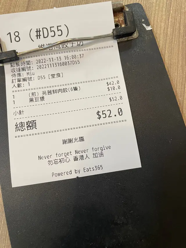 叫咗芫茜鮮肉煎餃6隻,加一支香港製造《正達》黑豆漿。已經唔係好多餐廳會搵到新鮮黑豆漿嚟飲,味道唔甜(佢寫每100克3.6g),有豆香味又滑,唔錯。